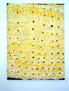 Alice’s Tjukurrpa or dreaming story is the porcupine or Tjilkamata. Her place of significance is Talaalpi, a swamp near the West Australian border. She retells her stories with bold, colourful abstractions representing the sandhills and swamplands of her country. The use of the colours yellow and red are important to Alice as they signify the colours of the ochres used in ceremonial body painting. The stories are often the tale of the porcupine searching for tucker or in turn being the source of bush tucker.